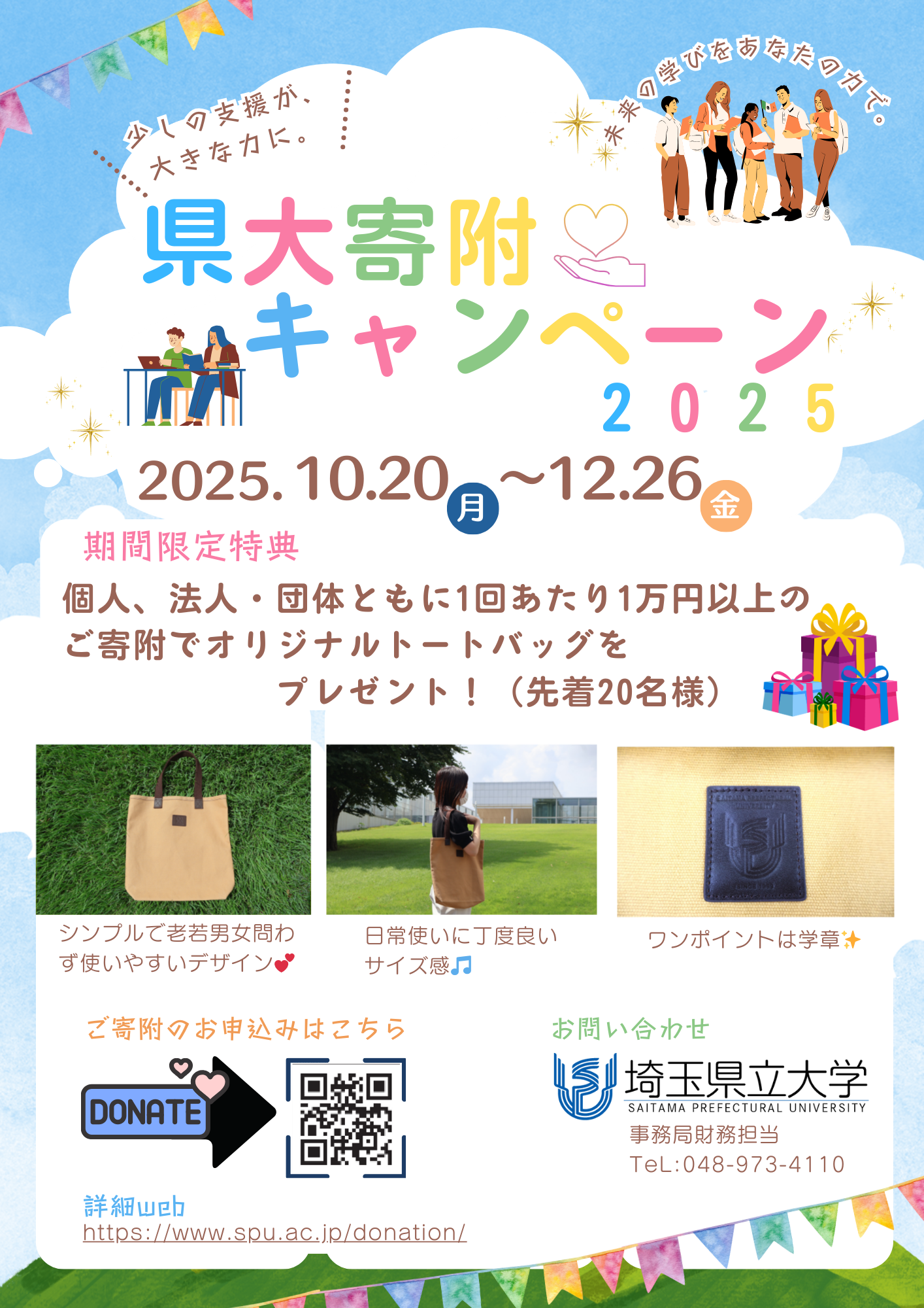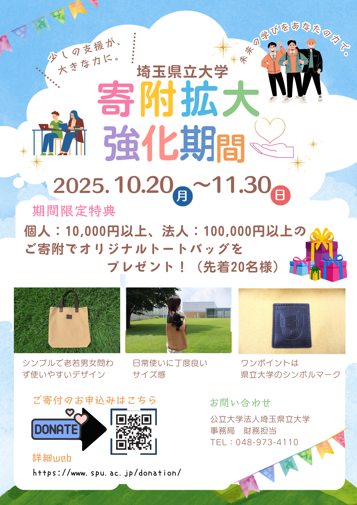 公立大学法人埼玉県立大学にご寄附いただきますと、税制上の優遇措置を受けることができます。 |