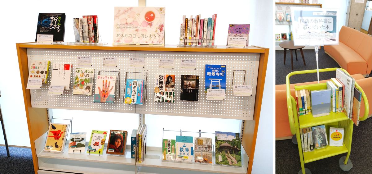 理学療法学科4年生の学生スタッフが作成。小学校、中学校、高校など、国語の教科書に掲載されている”本”は、一部抜粋であることがほとんど。それらの作品を「今、改めて読んでみよう」という展示。この機会に是非。