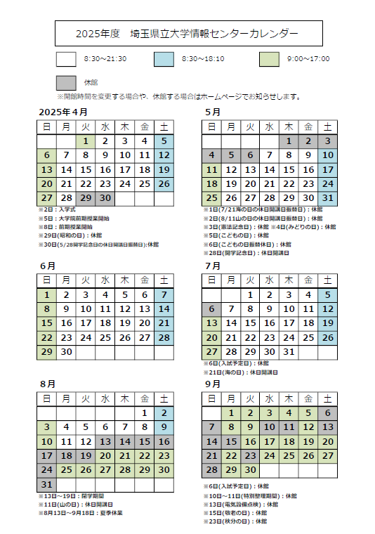 ホームページの「お知らせ」や下記のカレンダー等を確認してください。