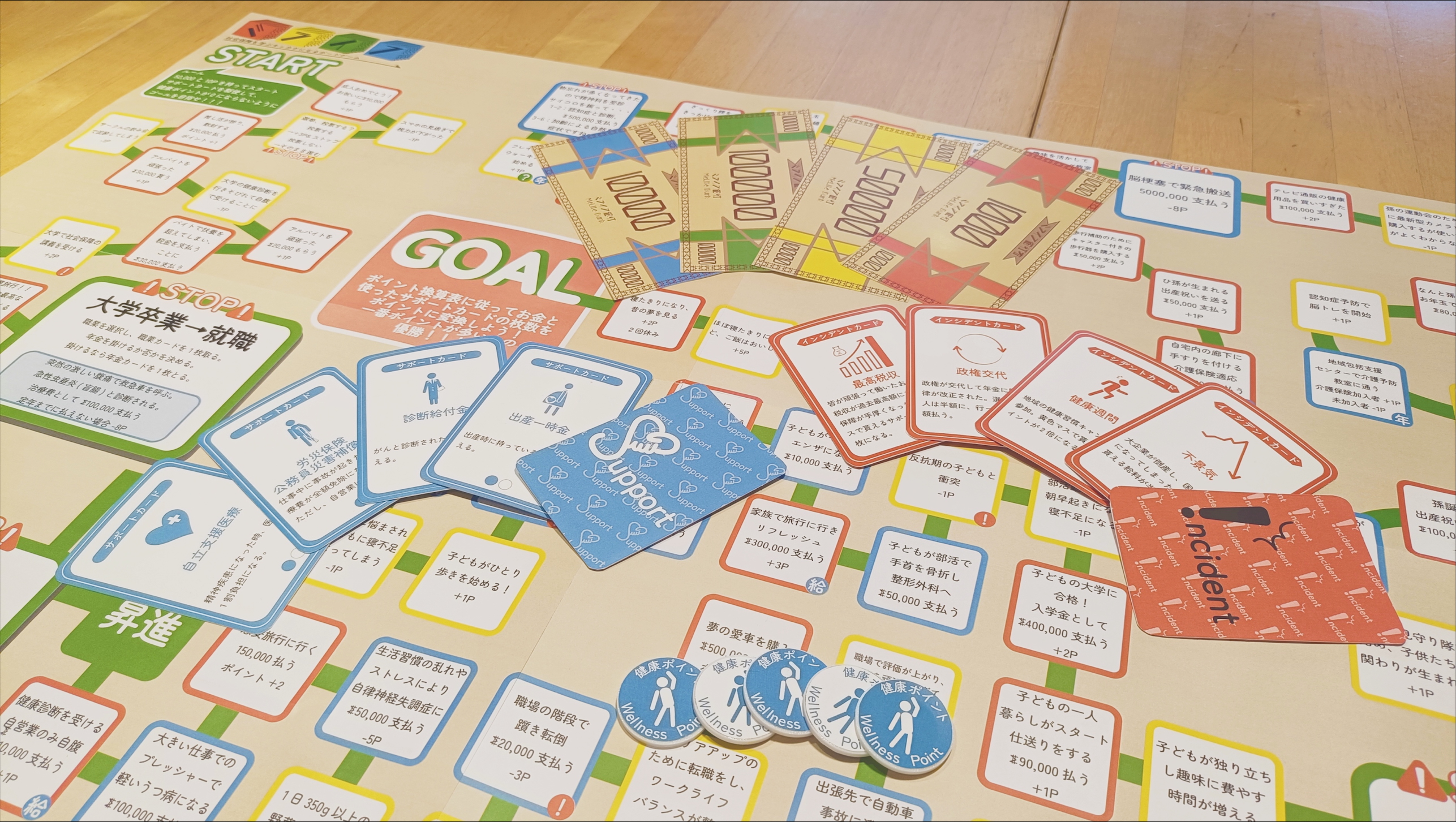 高校生から大学生までの若者が、社会に出る前に社会保障を楽しく学ぶきっかけを得られるすごろく型ボードゲーム。