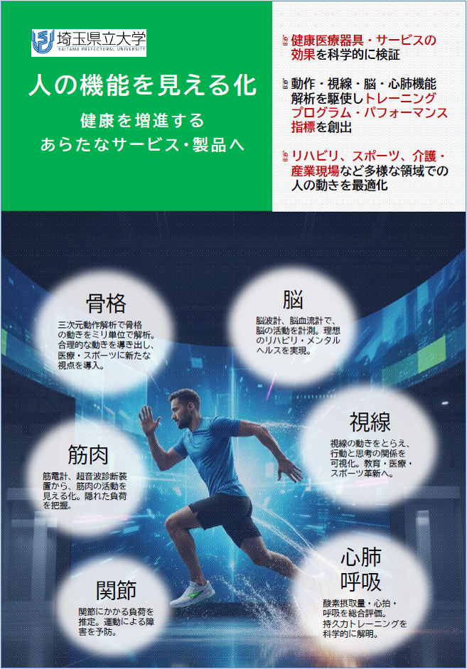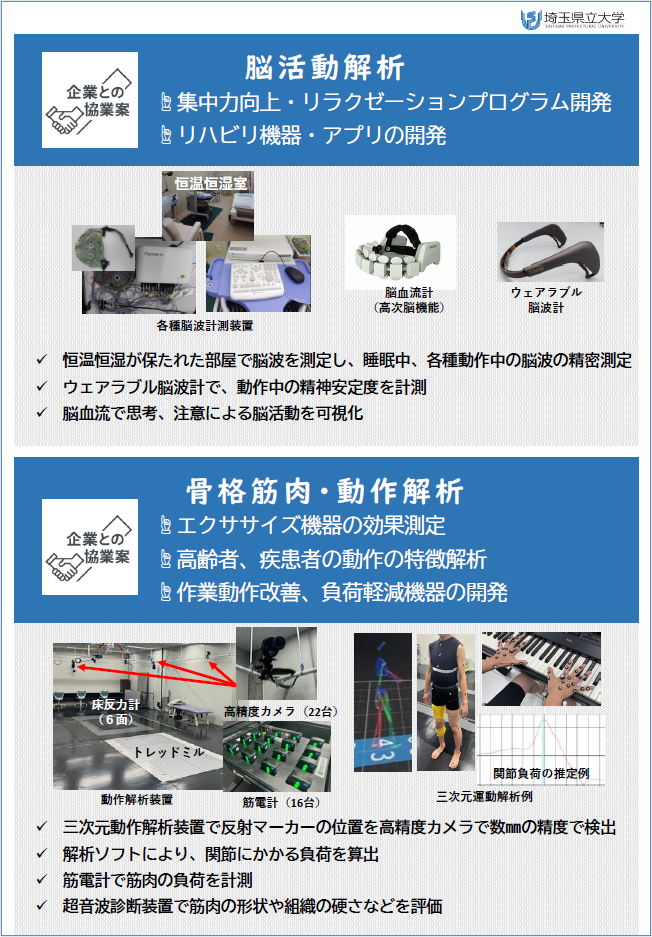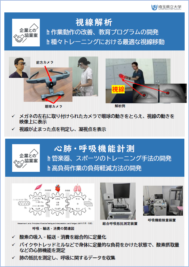 本学には、呼吸機能・心肺機能・動作・視線・脳活動解析といった、身体機能を多面的に計測・解析できる設備が揃っています。 これらを活用した、産官学連携のご提案をしました。