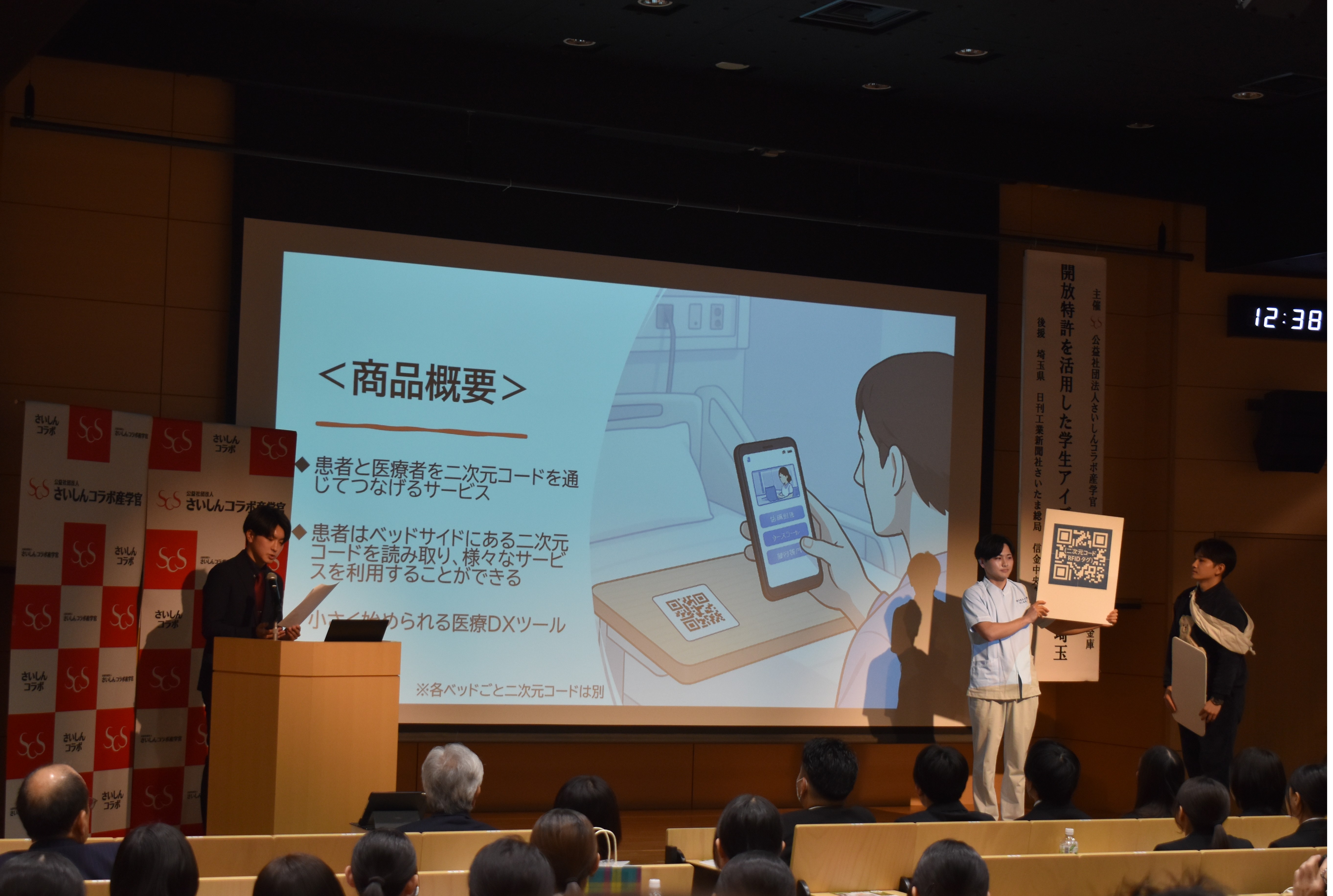 「開放特許を活用した学生アイデア発表会in埼玉」は、学生チームが大手企業の提供する開放特許を活用した商品アイデアを創出し、創出されたアイデアを埼玉県内の中小企業が商品化・競争力をつけることを目的に、公益社団法人さいしんコラボ産学官主催にて開催されるイベントです。