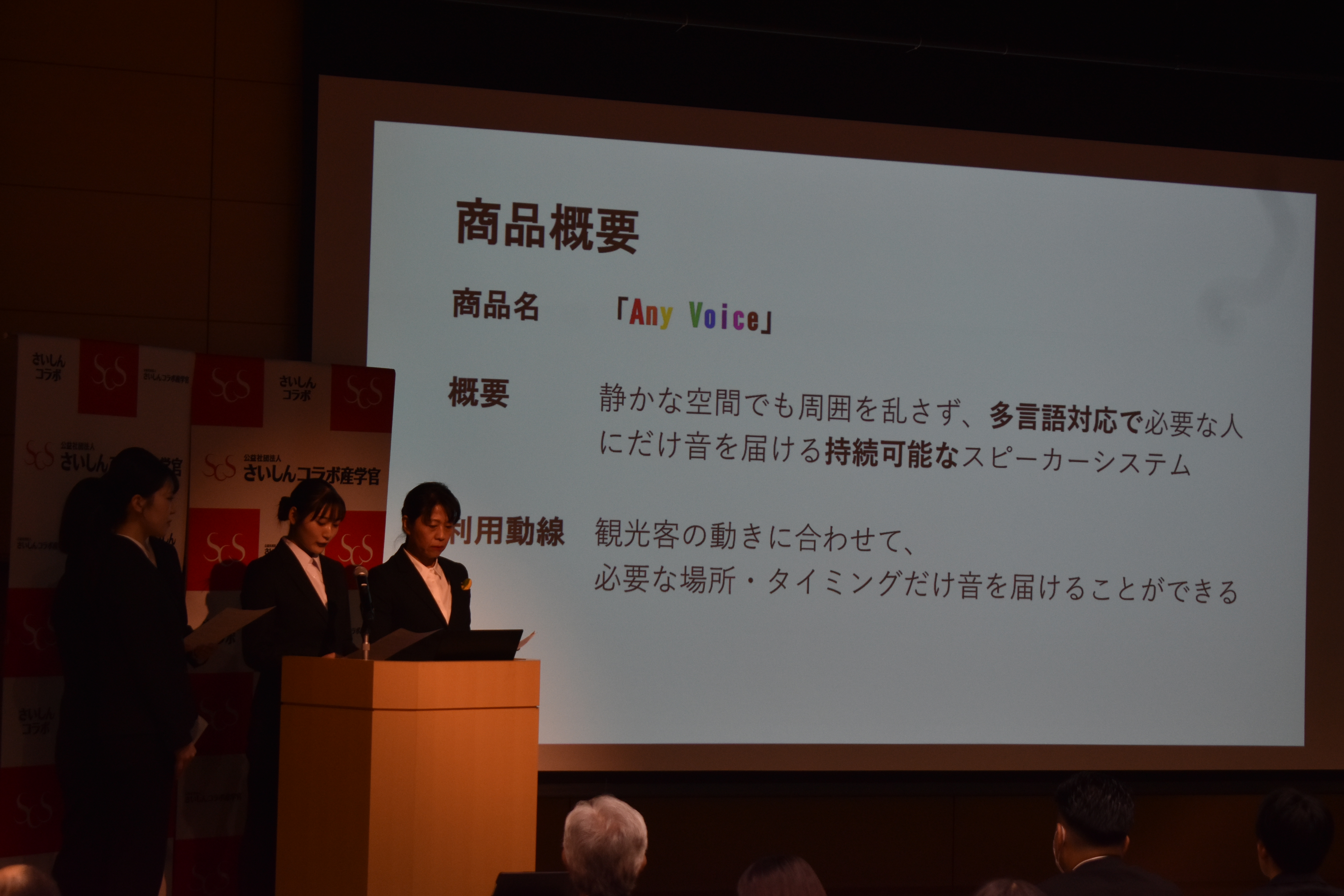 2025年12月2日(火)さいしんホール(さいしん熊谷本町ビル3階)にて、最終発表会が開催され、本学から学生5チームが商品企画アイデアを発表(プレゼンテーション)しました。その結果、下記のとおり各チームが受賞しました。