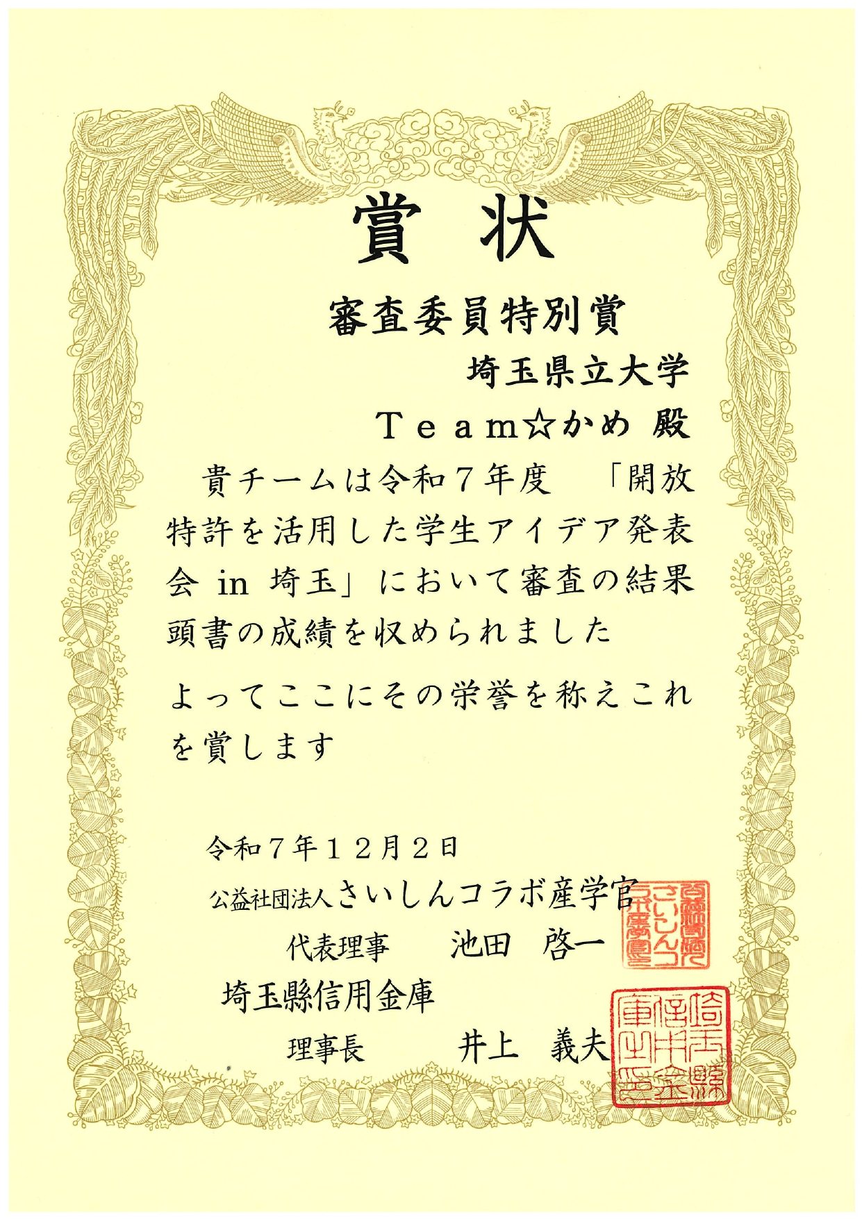 この度は「開放特許を活用した学生アイデア発表会in埼玉」において、審査委員特別賞を受賞することができ、Team☆かめ一同、大変光栄に思っております。