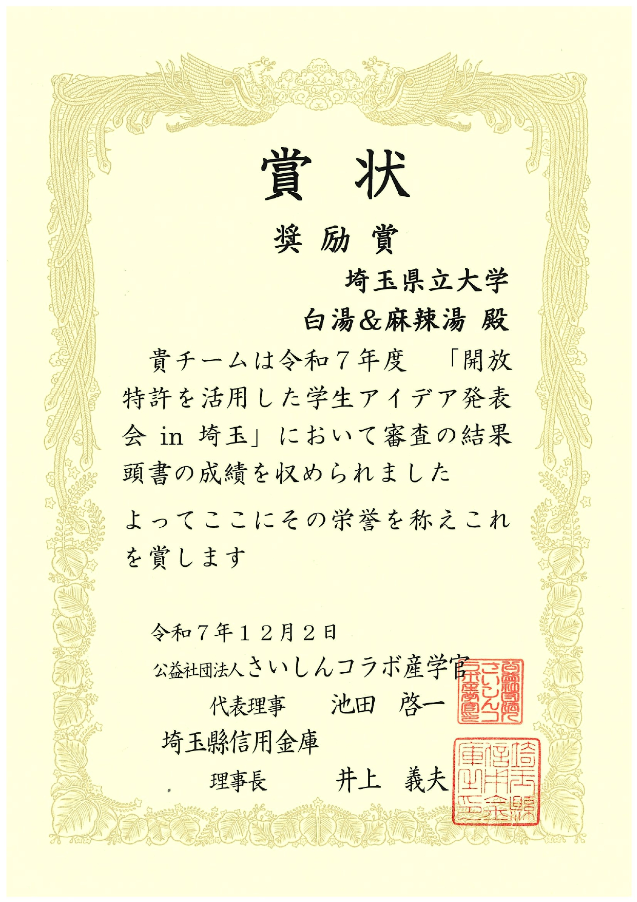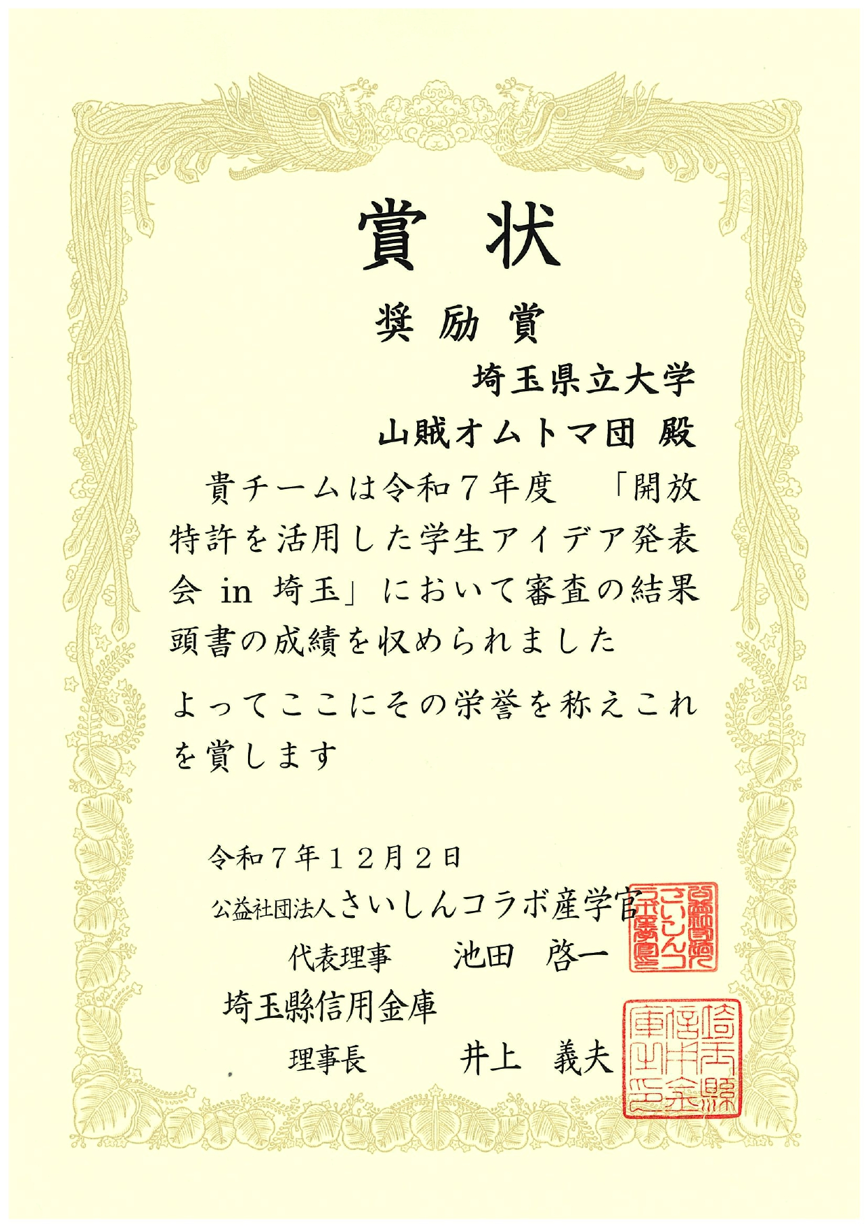 この度「開放特許を活用した学生アイデア発表会in埼玉」にて審査委員特別賞を受賞しました。