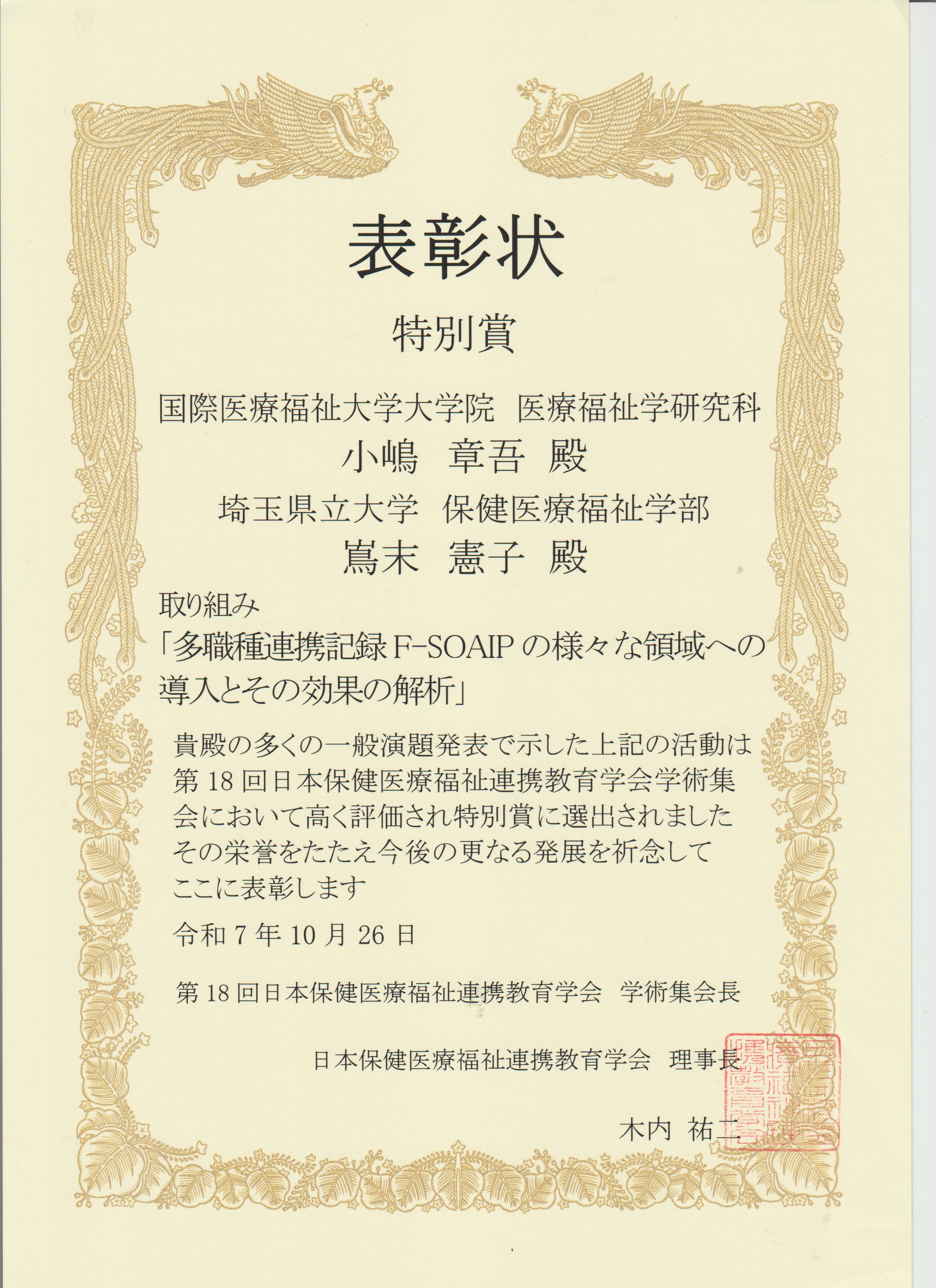 嶌末憲子教授(社会福祉子ども学科)が開発したF-SOAIP(エフソ・アイピー)をテーマとした複数演題が第18回日本保健医療福祉連携教育学会学術集会で特別賞を受賞しました
