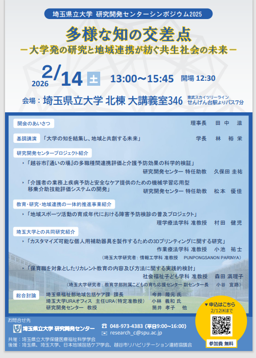 会 場 : 埼玉県立大学 北棟 大講義室346 大学へのアクセスはこちらをクリックしてください ※大学内の駐車場には限りがございますので、可能な限り公共交通機関のご利用をお願いします。 参加費 : 無料 ◆ 申込は下記のフォームよりお願いします。 申込〆切 2月12日(木) https://business.form-mailer.jp/fms/0cef21e3310771